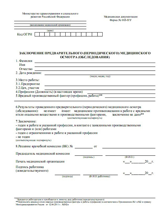 Заключение по результатам предварительного или периодического медицинского осмотра оформляется в соответствии с приказом 302н Минздравсоцразвития. Включает результаты обследований, необходимых для работы с вредными производственными факторами и на работах с особыми условиями труда.